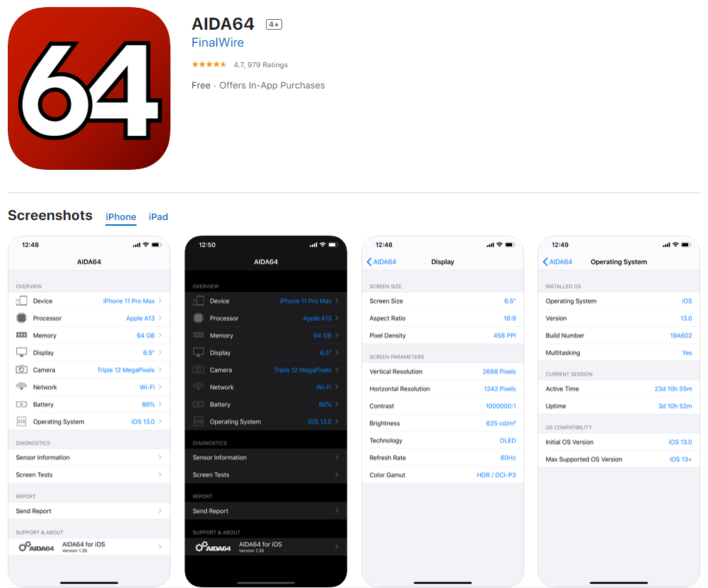 We figured it was essential to have AIDA64 running mobile devices as well, and by this we developed an app for iOS too. We decided to have a fully native application with native UI on iOS despite the much different platform and look & feel compared to Android -- especially 5 years ago. We were curious how the app would perform on a closed platform with relatively small number of device types. Despite that, in the past half a decade we have achieved over 2.2 million downloads in the App Store.