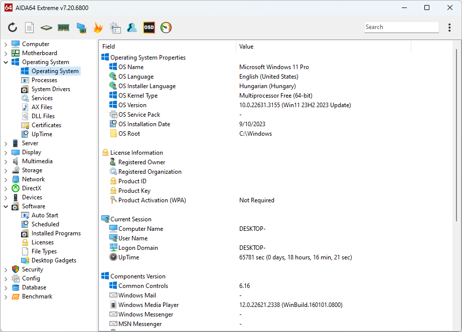 AIDA64 provides over 50 pages of information on installed programs, software licenses, security applications, and Windows settings. List of started processes, services, DLL files, startup programs, and visited web pages is also available.