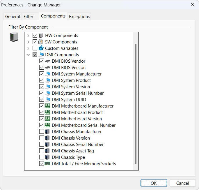 On the Components tab, you can further filter reports by selecting the components to display in the Change Manager list. This is useful when the report contains more information than needed. For example, if you only want to review hardware changes, select HW Components only.