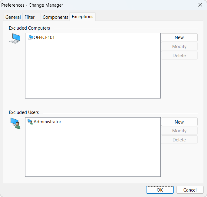 On the Exceptions tab, you can exclude specific computers or users from the listing in Change Manager. This is useful if you do not want to monitor changes for all computers or users. You can add exceptions to the Excluded computers/users lists, and these items can be modified or deleted at any time.
