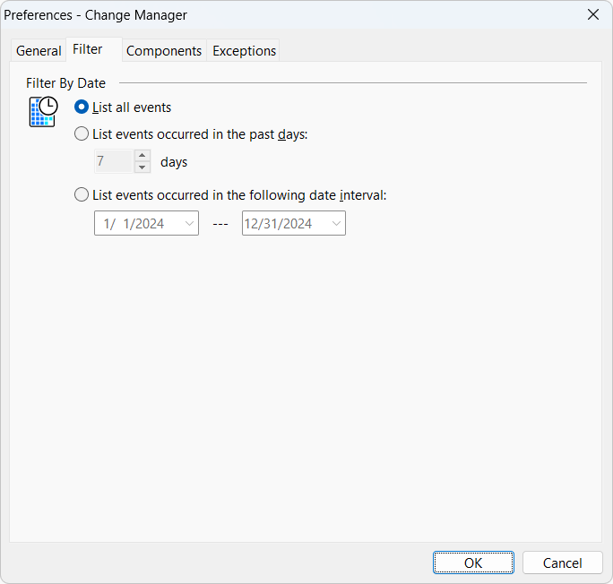 On the Filter tab, you can select the time period for displaying reports in Change Manager. You can list all events, events from the past few days, or set a specific date interval. This helps in locating changes more easily. For example, you can review changes weekly instead of viewing all changes from the earliest reports.