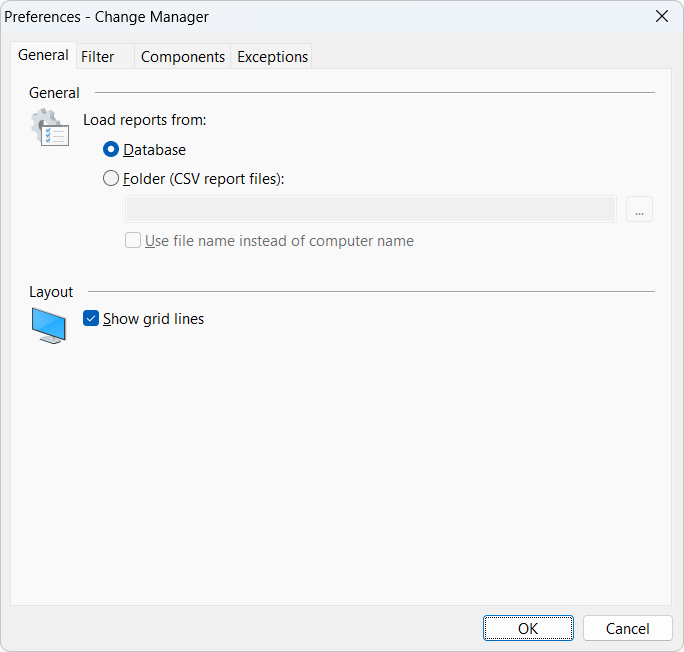 On the General tab in Change Manager Preferences, you can choose to load reports from a database or a folder containing CSV report files. For network audits, it is recommended to save reports in CSV format, as they can be imported into a database later if needed. Using Report Converter, you can also convert XML reports into CSV reports.
