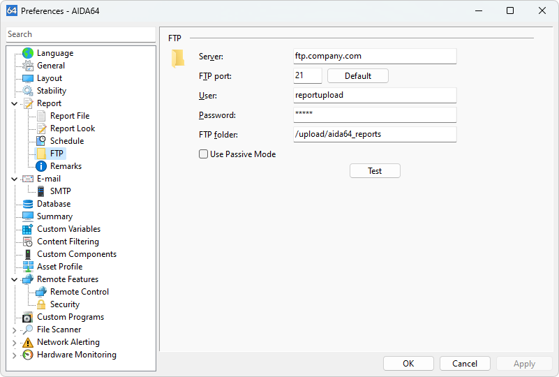 Specifies the FTP password for FTP login. The password is stored in the AIDA64.INI file using strong encryption. For anonymous login, set the FTP password to a non-existent but correctly formatted email address, such as "officer@company.com." Due to security concerns, it is not recommended to use anonymous FTP upload services.