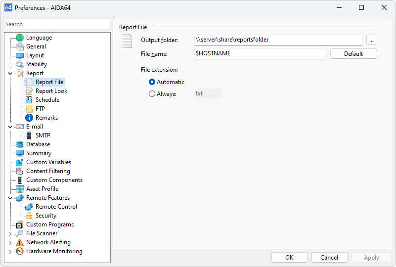 This option specifies the folder where AIDA64 report files should be saved. For network audits, this folder should be a UNC path (e.g., \\server\share\folder), and all users should have file creation and write permissions for this folder. You can use the following special file control strings in both the output folder name and file name: