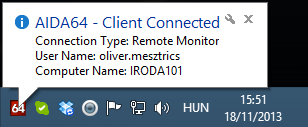 On client computers, a bubble notification appears above the notification area to inform the user of connection attempts. During an active session, the AIDA64 icon in the notification area turns red. The bubble notification and icon can be hidden using the /SILENT command-line option.