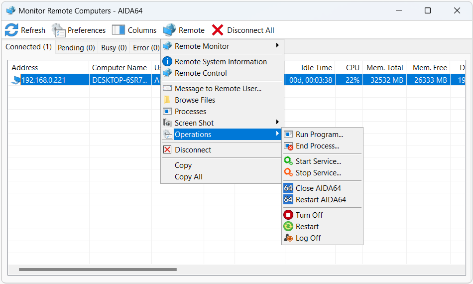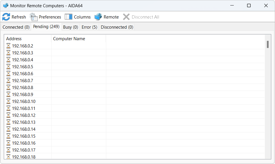 After pressing "OK", the IP addresses of the PCs will appear in the Pending tab as AIDA64 attempts to connect. Successfully connected PCs will be listed in the Connected tab, while those already connected to another session will appear in the Busy tab. PCs that could not be connected to will be listed in the Error tab, and previously connected PCs will be in the Disconnected tab.