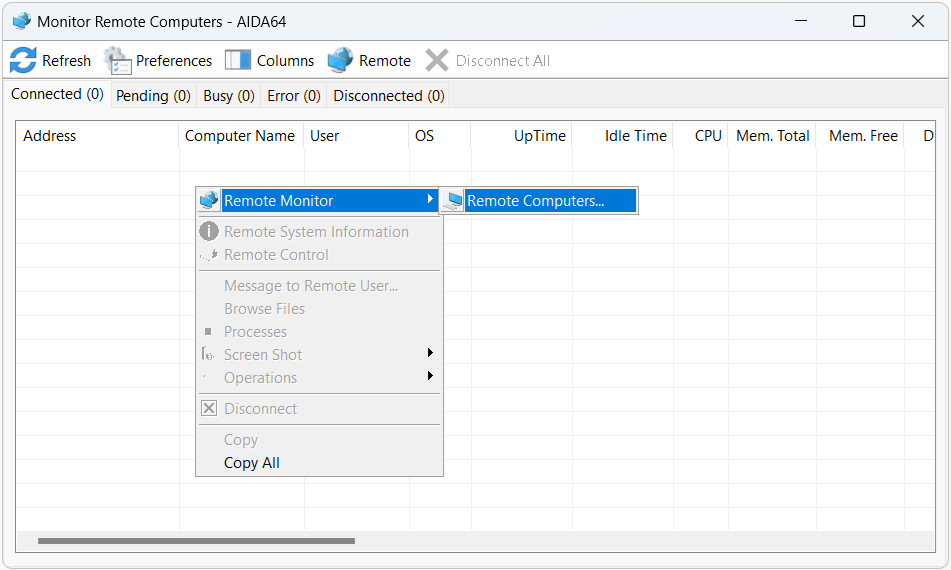 To establish a connection, right-click on a blank area in the Monitor Remote Computers window to activate the context menu. Select Remote Monitor and then Remote Computers.