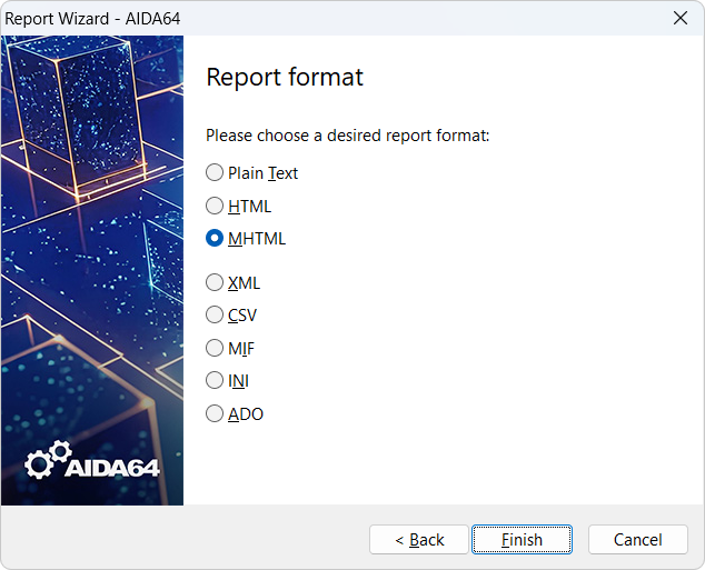 Creates the report in MHTML (MIME HTML) format, which includes small icons. MHTML reports can be opened with MS Internet Explorer 5 and later, and recent versions of other HTML browsers. The layout can be customized in Preferences > Report > Report Look. Like HTML reports, MHTML reports are good for printing or filing but cannot be used by AIDA64 Audit Manager and Change Manager.