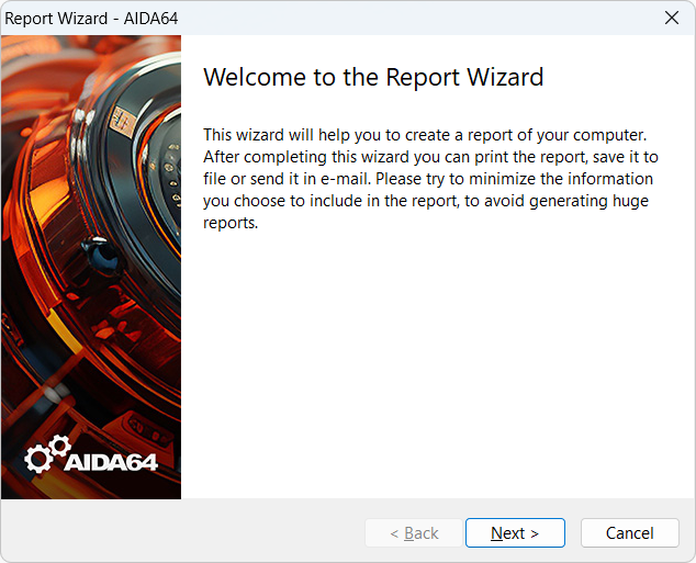 With the Report Wizard in AIDA64, creating reports is a breeze. You can start the Report Wizard by clicking the Report button on the toolbar or selecting Report Wizard from the Report section under the kebab menu. It follows the familiar Windows wizard layout. The first page is a welcome page, and on the second page, you can select the report profile you want to use. A report profile is simply a list of pages from the Page menu to be included in the report. AIDA64 provides predefined report profiles for quick creation of standard reports, and it also allows for custom report profiles by selecting specific pages or loading a previously created custom profile.