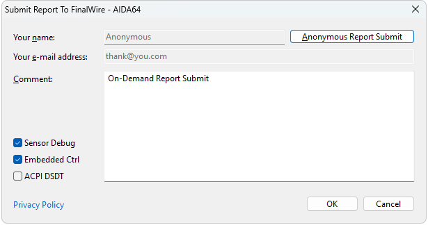 If you prefer to send reports anonymously, you can click the "Anonymous report submit" button. You can also include additional technical details in the message by checking the Sensor Debug, Embedded Controller, and ACPI DSDT boxes. To finalize and send the report, simply click "OK."