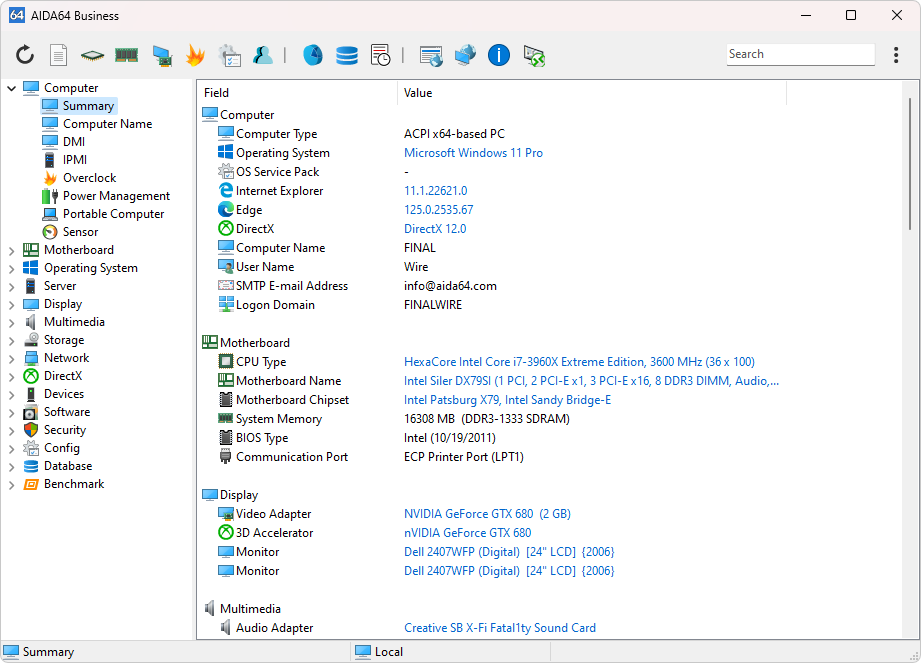 The Summary page lists the main hardware and software components of the given PC. We can select the individual items we would like to see here and add custom variables to the page in Preferences / Summary. We can also add custom components to the Summary page in Preferences / Custom Components and custom variables in Preferences / Summary.