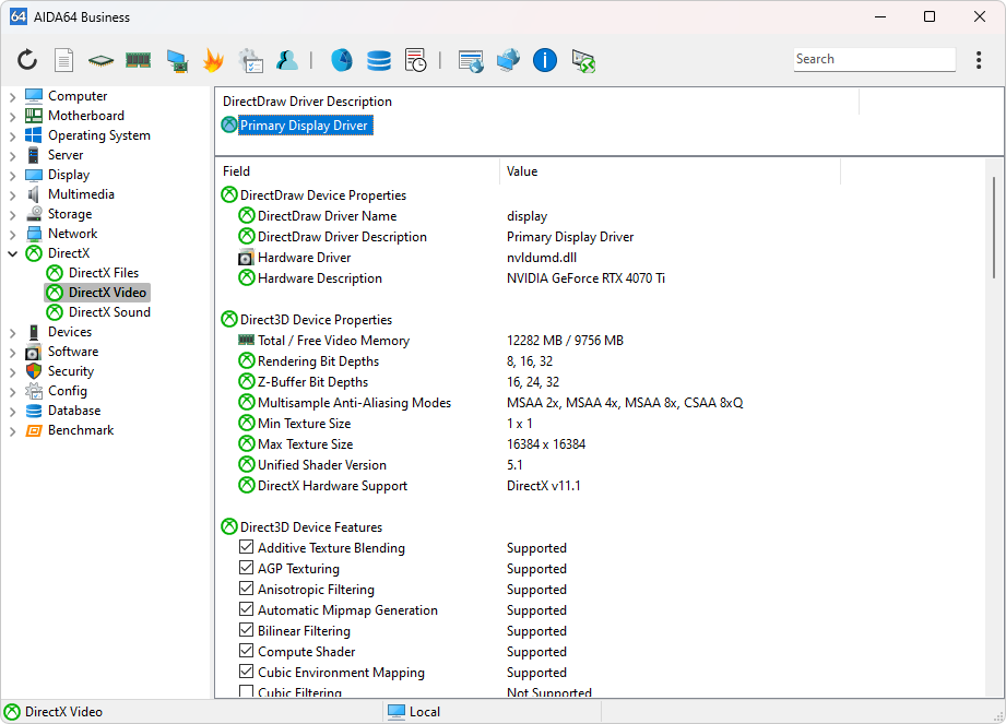 This page lists all installed DirectX files. Double-clicking any item will open the file properties window.