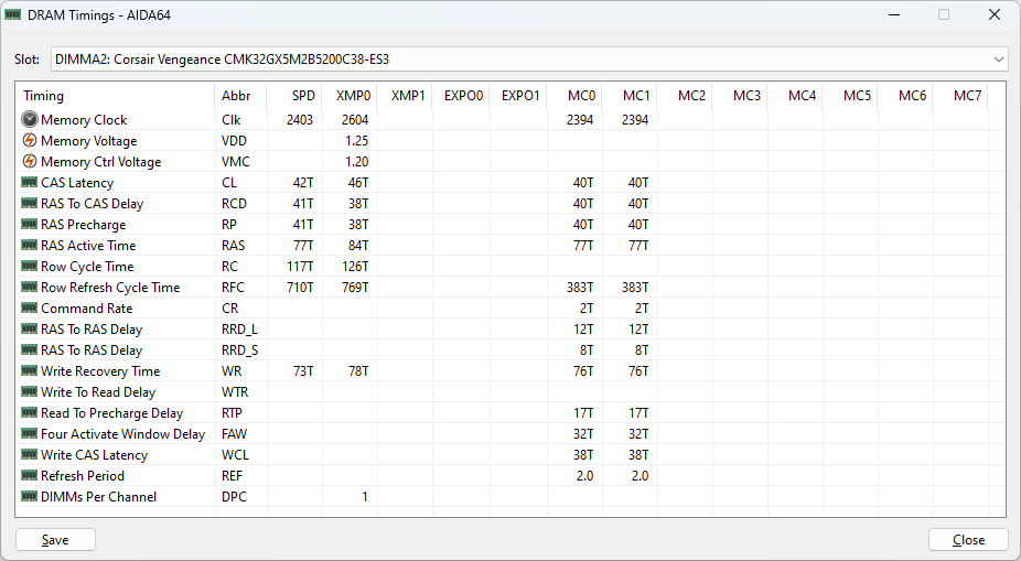 The DRAM Timings window in AIDA64 offers in-depth insights into the various timing parameters of your memory modules. This is crucial for enthusiasts and professionals who need to fine-tune their system for optimal performance or stability. Here is a breakdown of the information and features available: